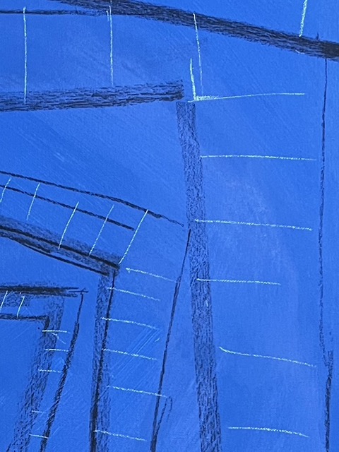 After considering options to represent Blanca’s story, I decide on acrylic paint on canvas, a familiar material that invites both exploration and surprise as I adapt to my new way of seeing. This medium creates a space where I can work within the realities of my low vision. It challenges me to make the piece as perceptible as possible for people with visual impairments, considering elements like texture and high-contrast colors, and the use of royal blue, which some individuals with low vision as myself can perceive sometimes.